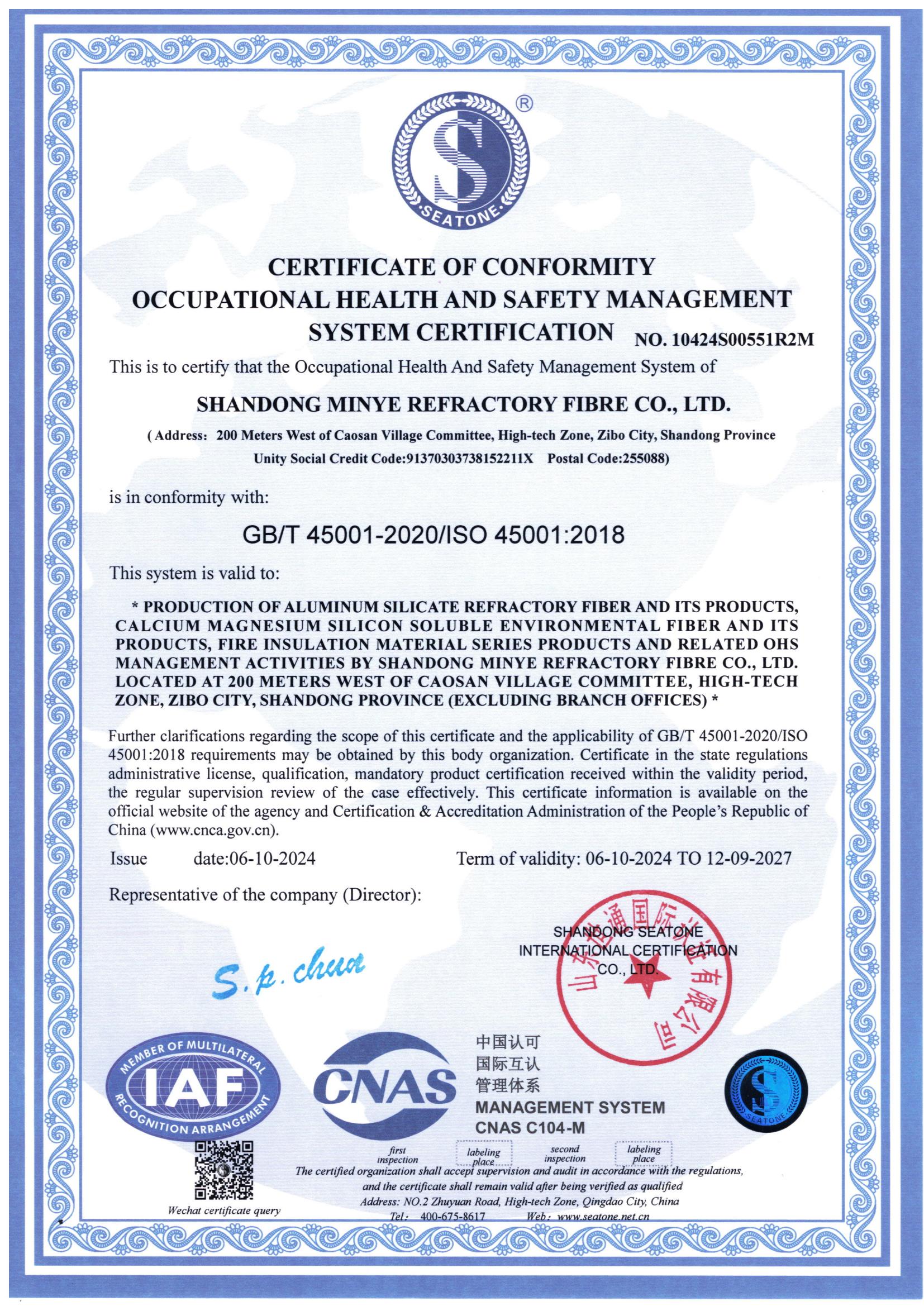 • 職業健康安全管理體系認證證書